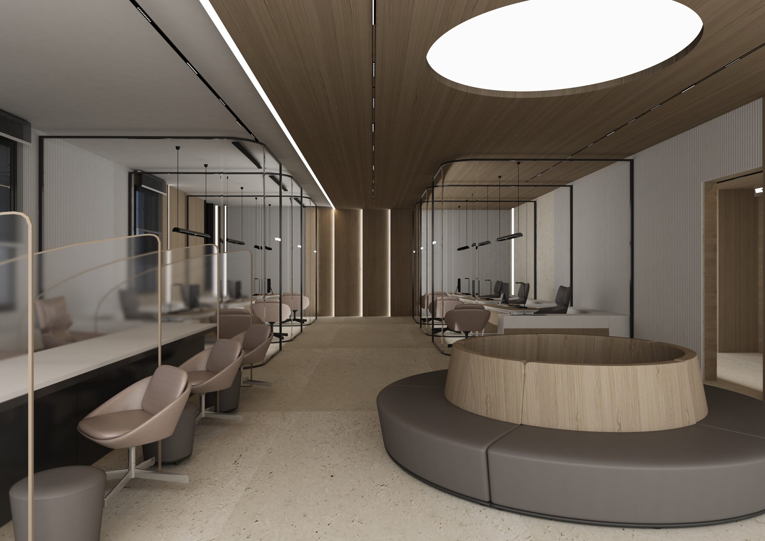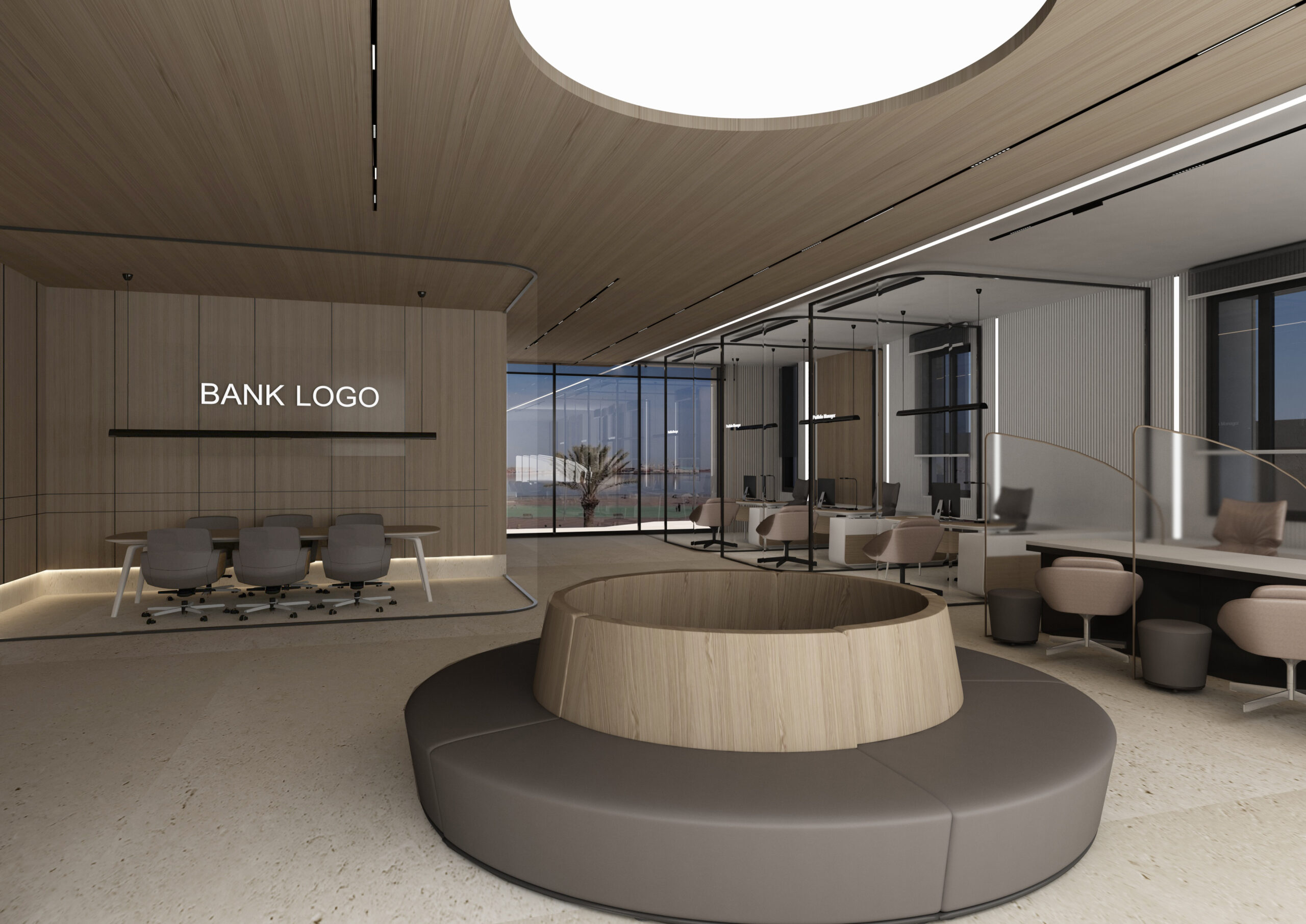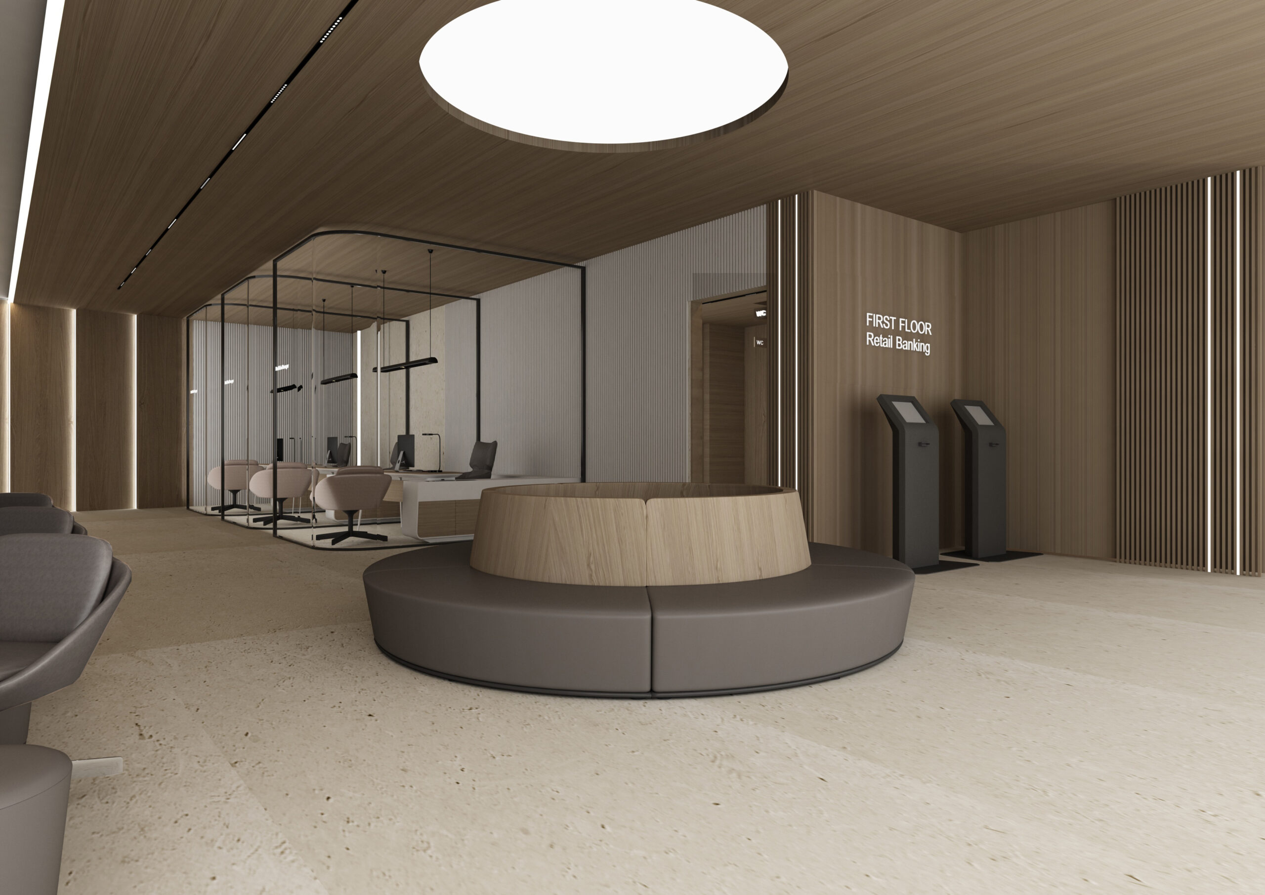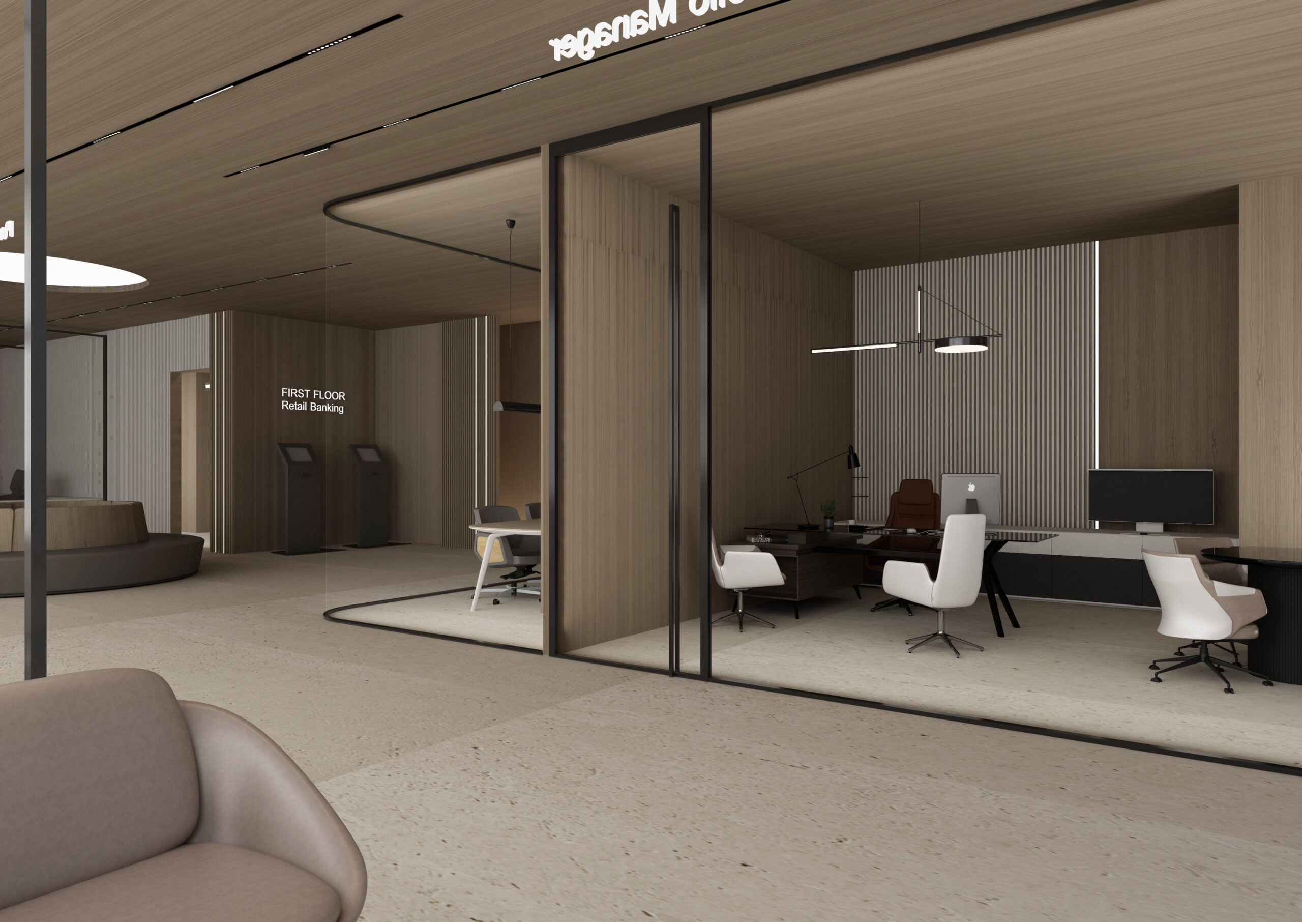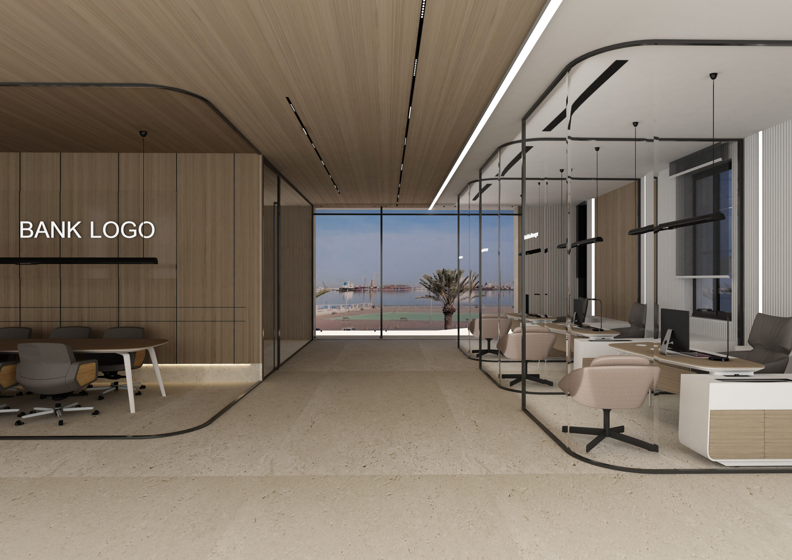 This project is a modern interior design concept developed for the Tripoli Dahra Bank Headquarters, located in Libya's financial heart. Transparency, trust, and institutionality are at the heart of the design, while natural stone floors, wood cladding, and linear LED lighting offer a timeless simplicity. Undulating ceiling forms and vertical light bands add dynamism to the space, while the Private Banking reception at the entrance, with its marble counter and wooden backdrop, highlights prestige. Open offices and individual consultation areas are arranged with glass partitions, striking a balance between transparency and privacy. Meanwhile, waiting areas are designed with a focus on comfort and ergonomic seating. The overall approach aims to strengthen a modern and corporate identity that reflects the bank's international vision while creating a spatial experience that fosters trust and loyalty.