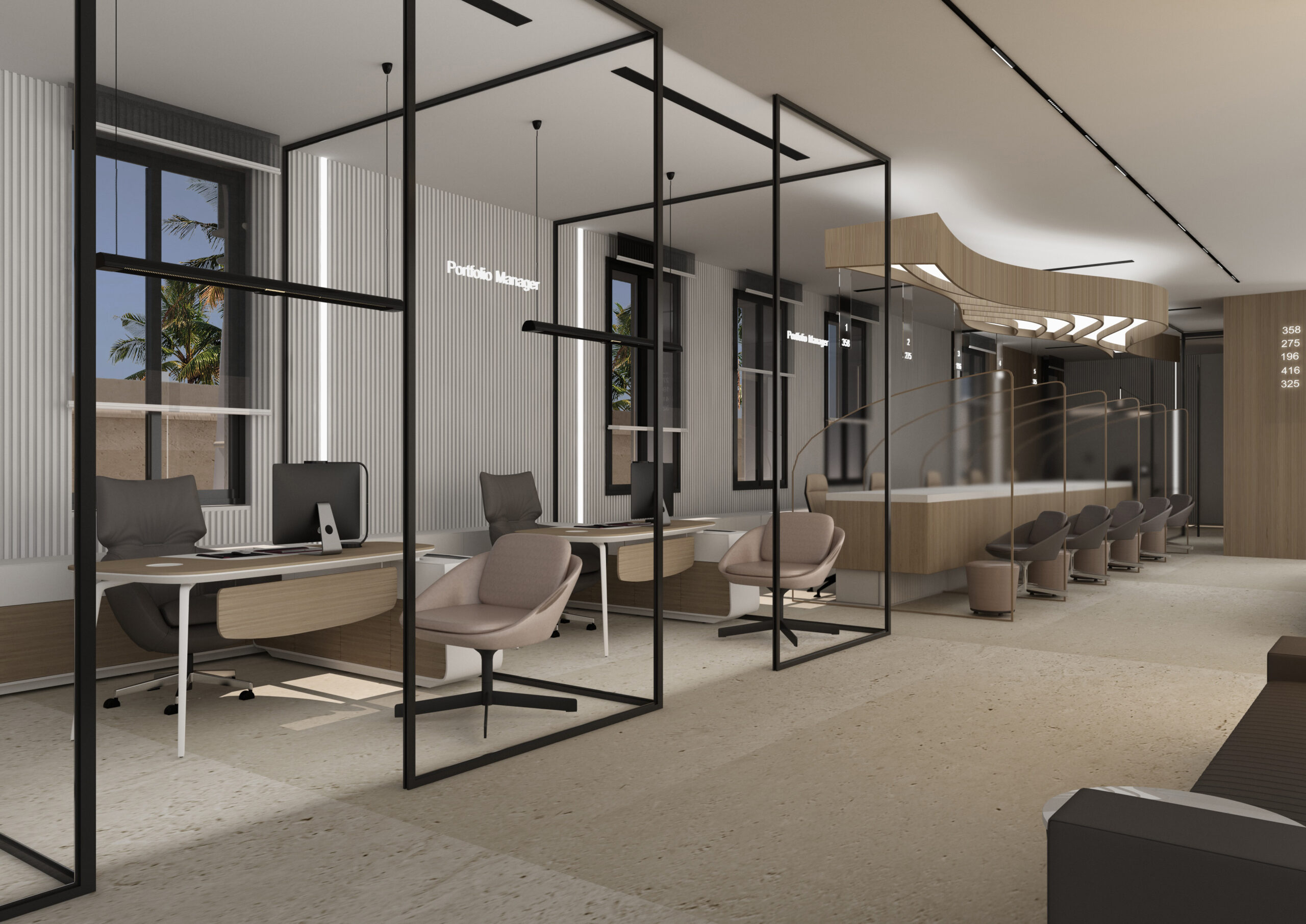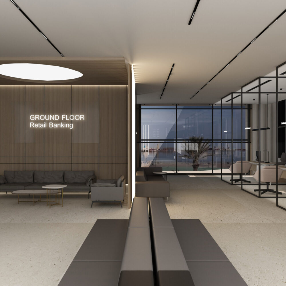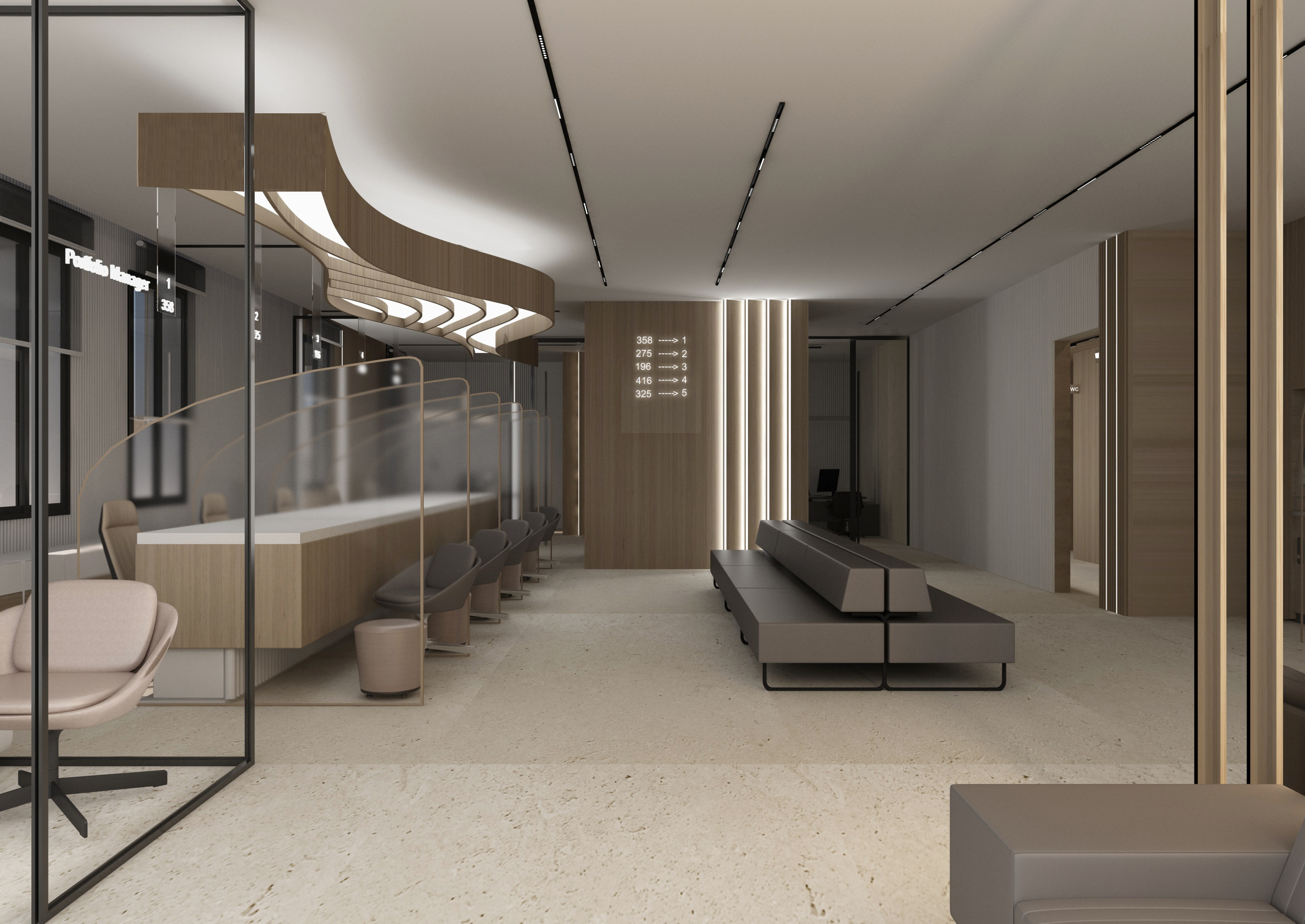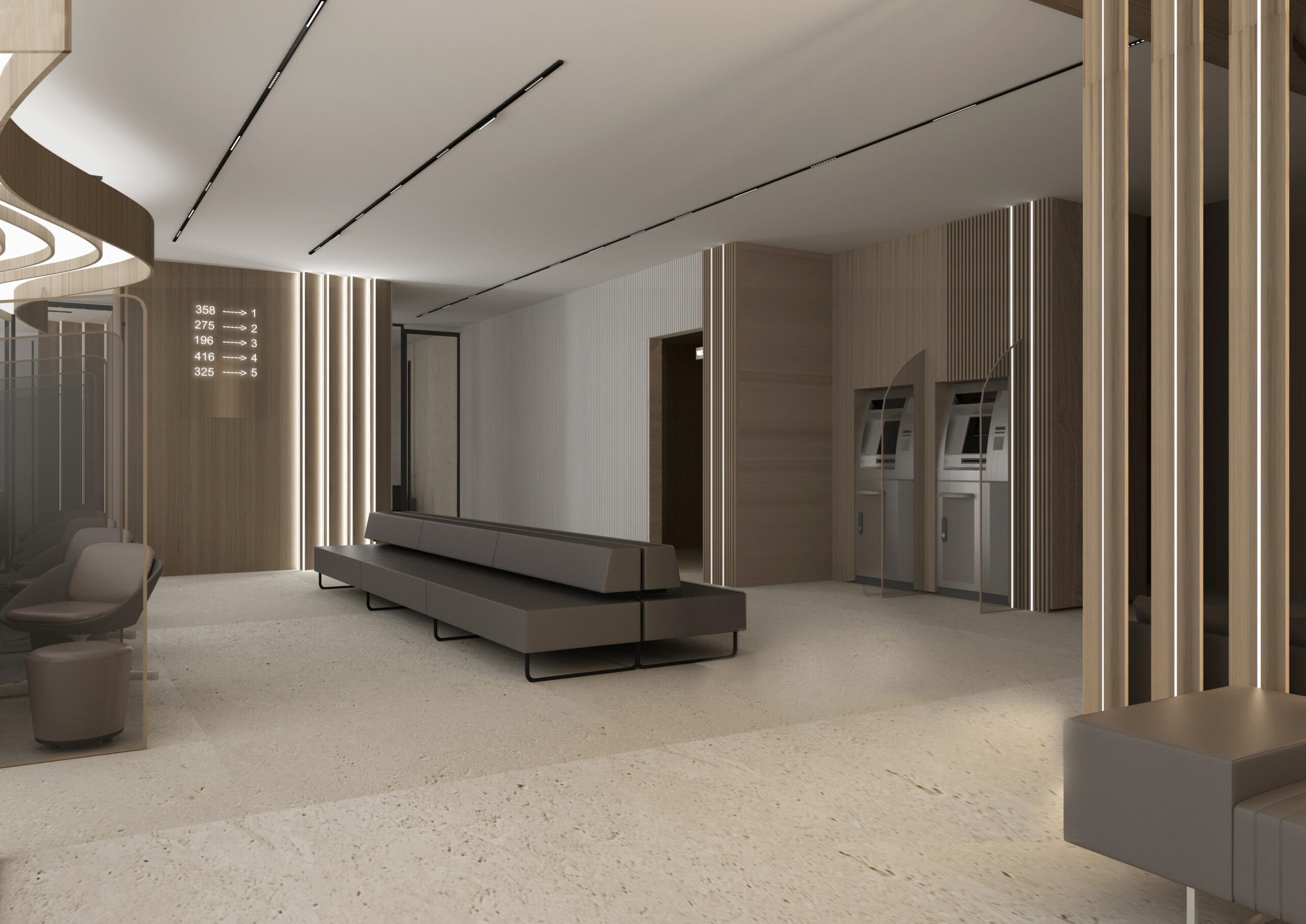 This project is a modern interior design concept developed for the Tripoli Dahra Bank Headquarters, located in Libya's financial heart. Transparency, trust, and institutionality are at the heart of the design, while natural stone floors, wood cladding, and linear LED lighting offer a timeless simplicity. Undulating ceiling forms and vertical light bands add dynamism to the space, while the Private Banking reception at the entrance, with its marble counter and wooden backdrop, highlights prestige. Open offices and individual consultation areas are arranged with glass partitions, striking a balance between transparency and privacy. Meanwhile, waiting areas are designed with a focus on comfort and ergonomic seating. The overall approach aims to strengthen a modern and corporate identity that reflects the bank's international vision while creating a spatial experience that fosters trust and loyalty.