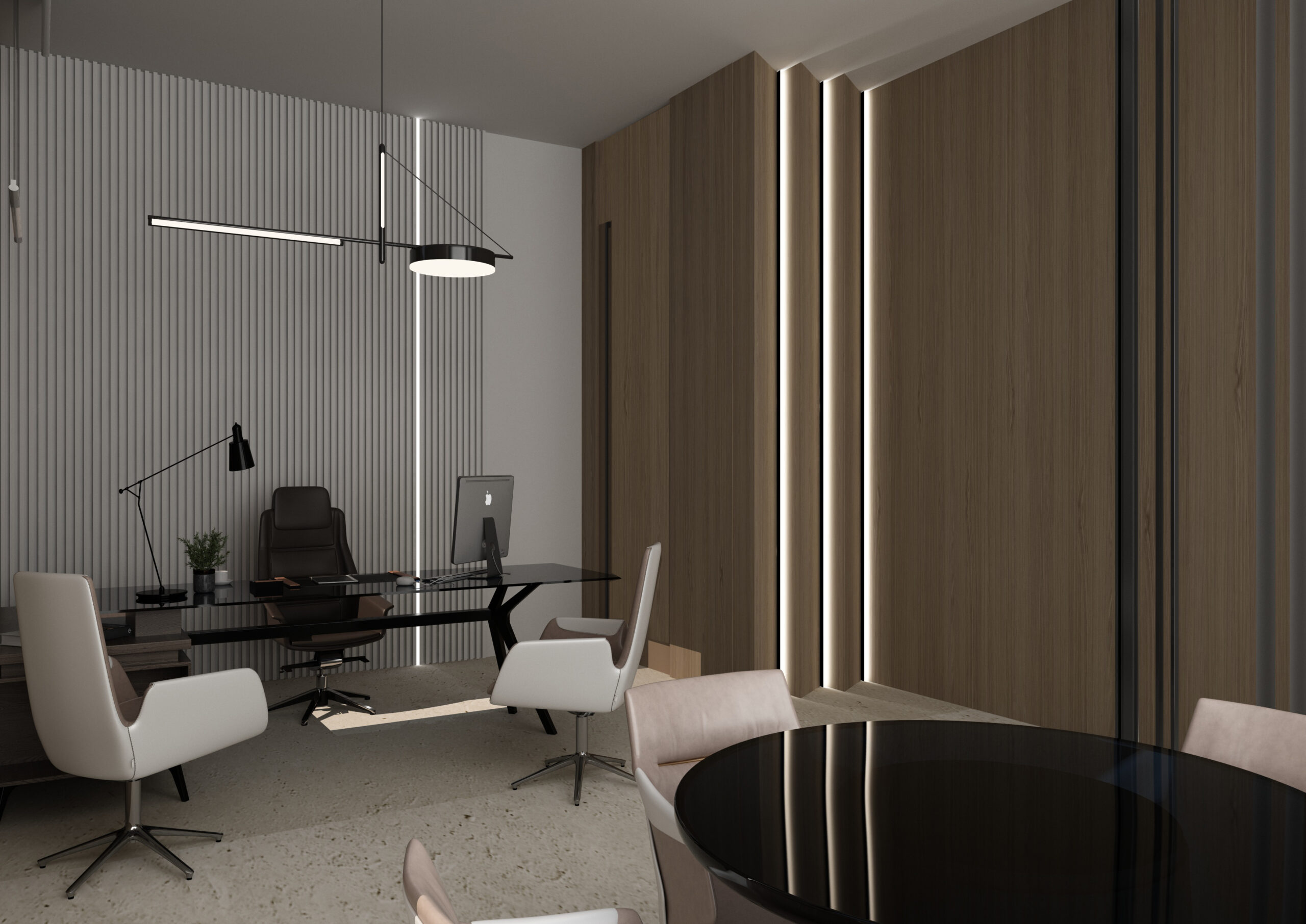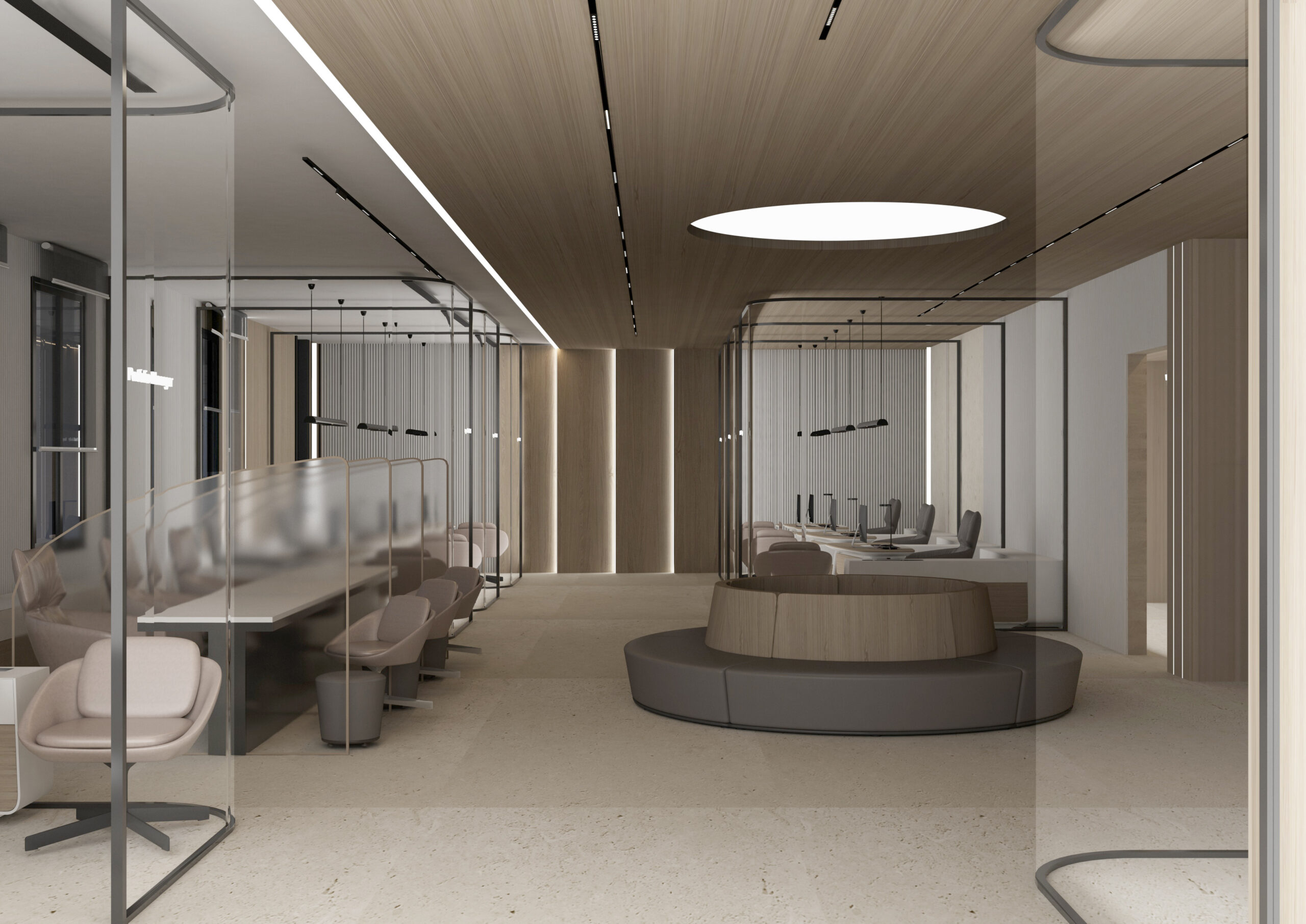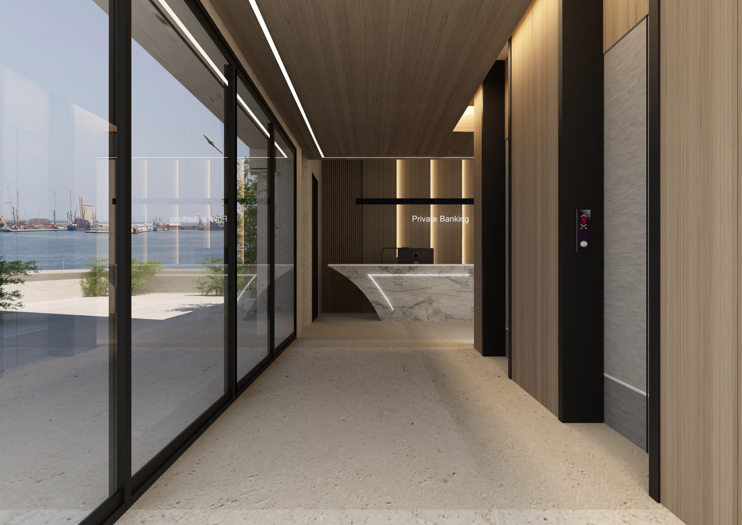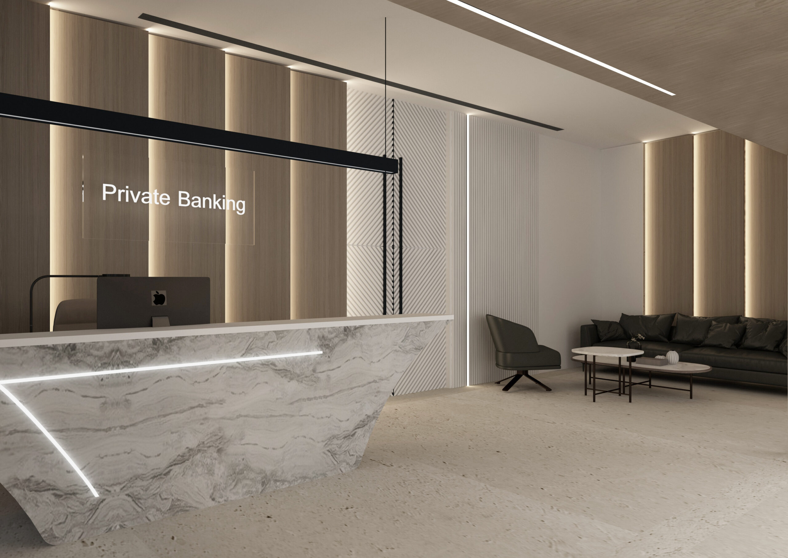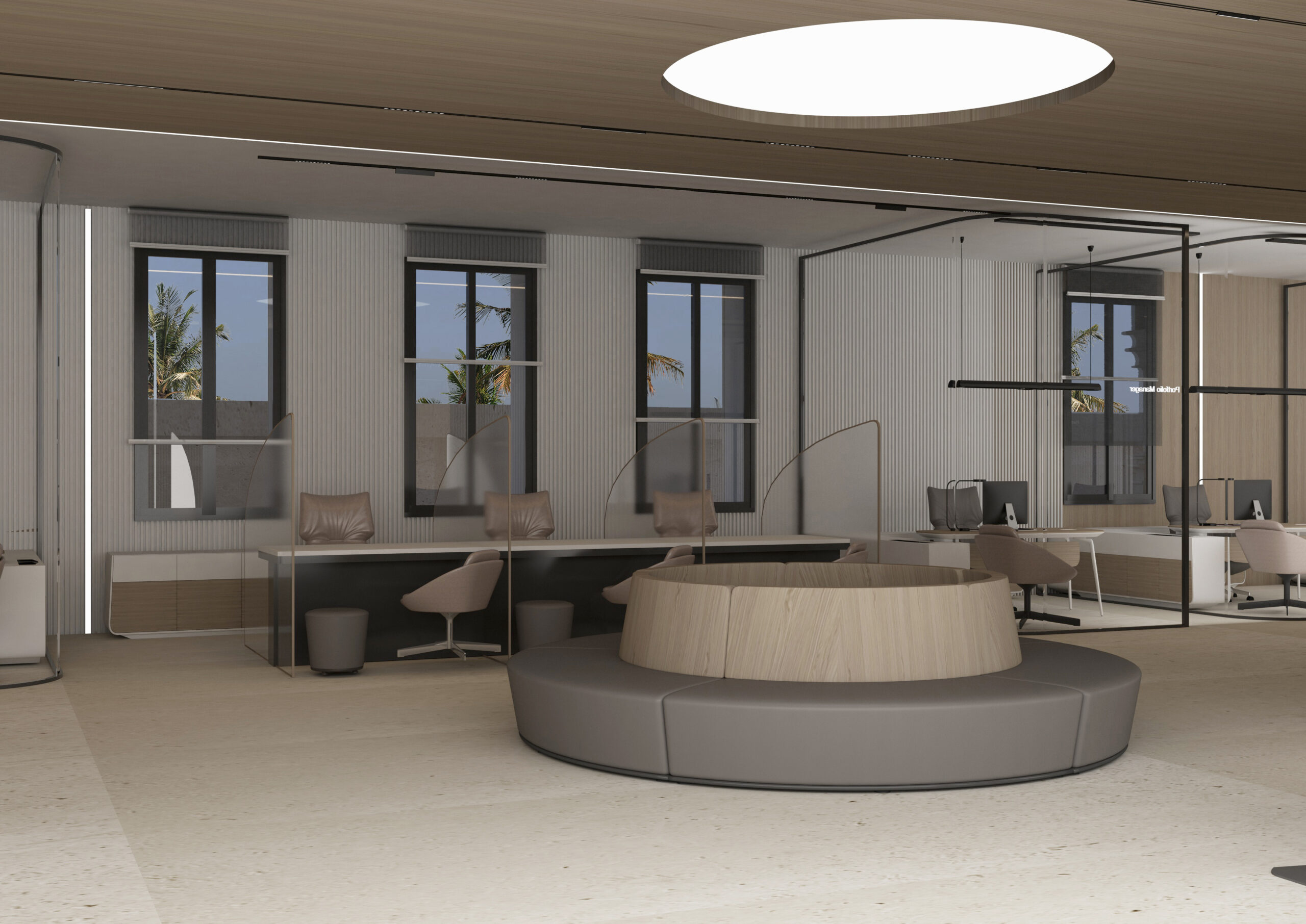 This project is a modern interior design concept developed for the Tripoli Dahra Bank Headquarters, located in Libya's financial heart. Transparency, trust, and institutionality are at the heart of the design, while natural stone floors, wood cladding, and linear LED lighting offer a timeless simplicity. Undulating ceiling forms and vertical light bands add dynamism to the space, while the Private Banking reception at the entrance, with its marble counter and wooden backdrop, highlights prestige. Open offices and individual consultation areas are arranged with glass partitions, striking a balance between transparency and privacy. Meanwhile, waiting areas are designed with a focus on comfort and ergonomic seating. The overall approach aims to strengthen a modern and corporate identity that reflects the bank's international vision while creating a spatial experience that fosters trust and loyalty.