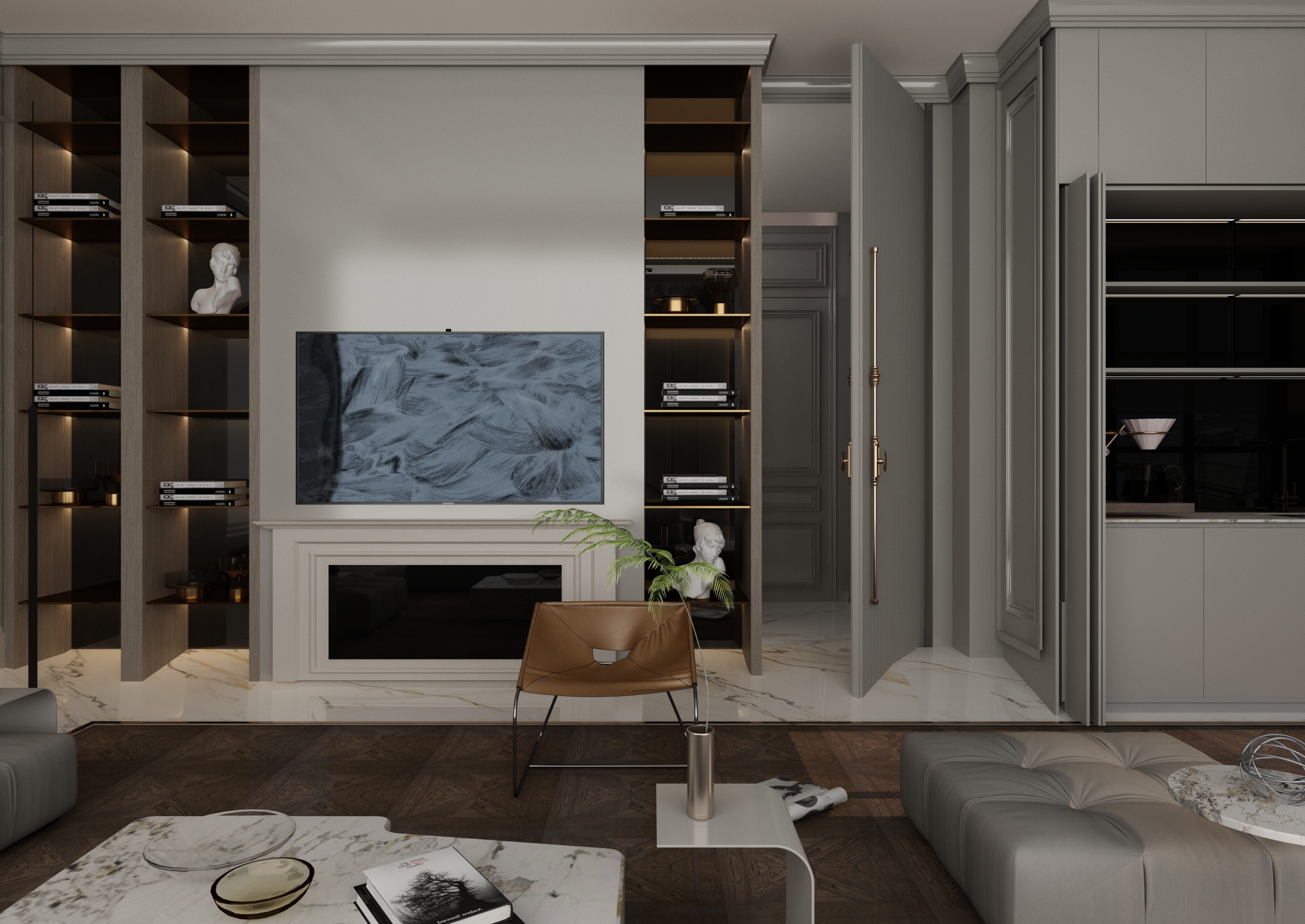 In the living room design, hidden storage solutions support a functional and minimalist approach, while the choice of furniture with modern lines emphasizes a comfortable living space. Throughout the project, simple forms and contemporary details reinforce the aesthetic and functional integrity of the spaces.