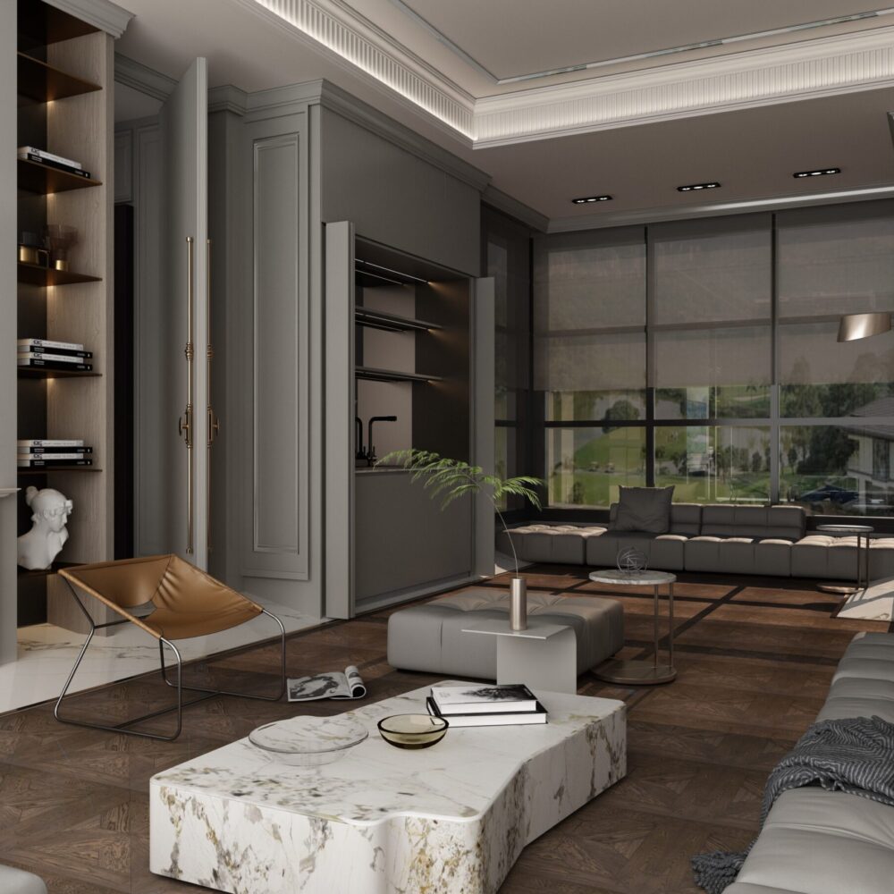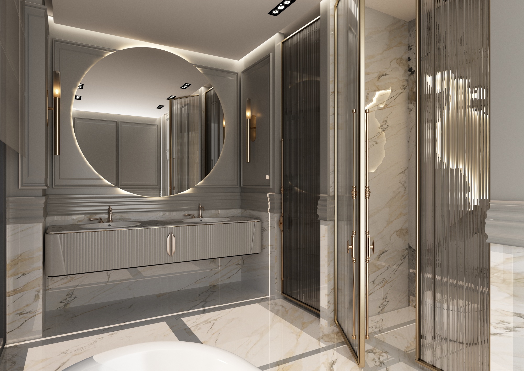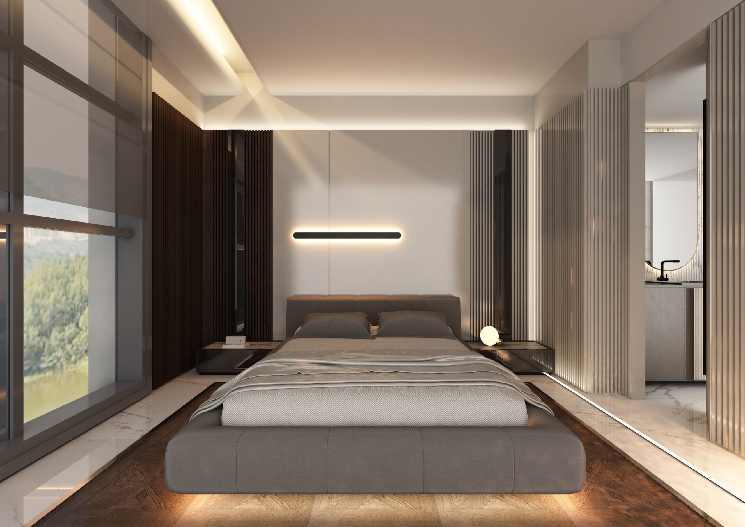 The interior design emphasizes wide openings and spacious volumes, aiming to maximize the amount of natural light entering the spaces. Thanks to the intelligent lighting systems used in the bedrooms, the space can be adapted to different moods and usage scenarios. The marble surfaces chosen for the bathrooms, combined with brass details, create a luxurious and timeless elegance.