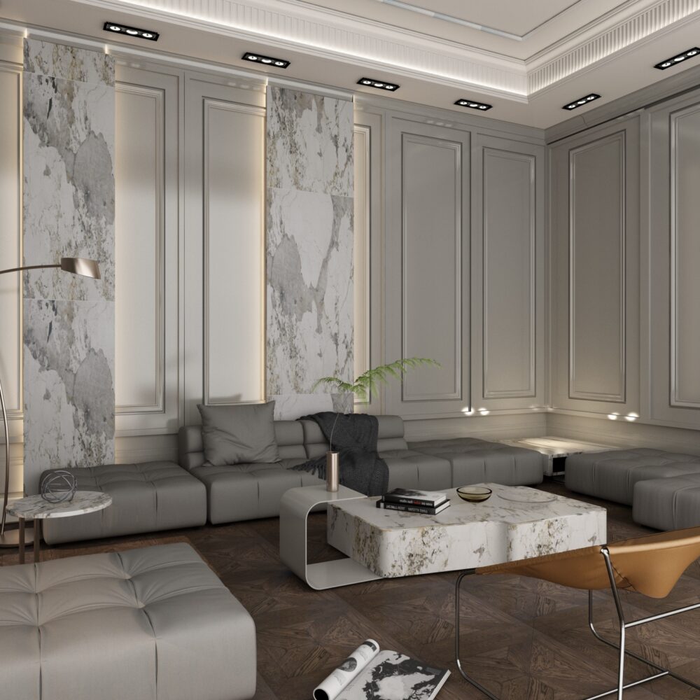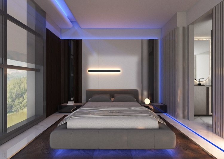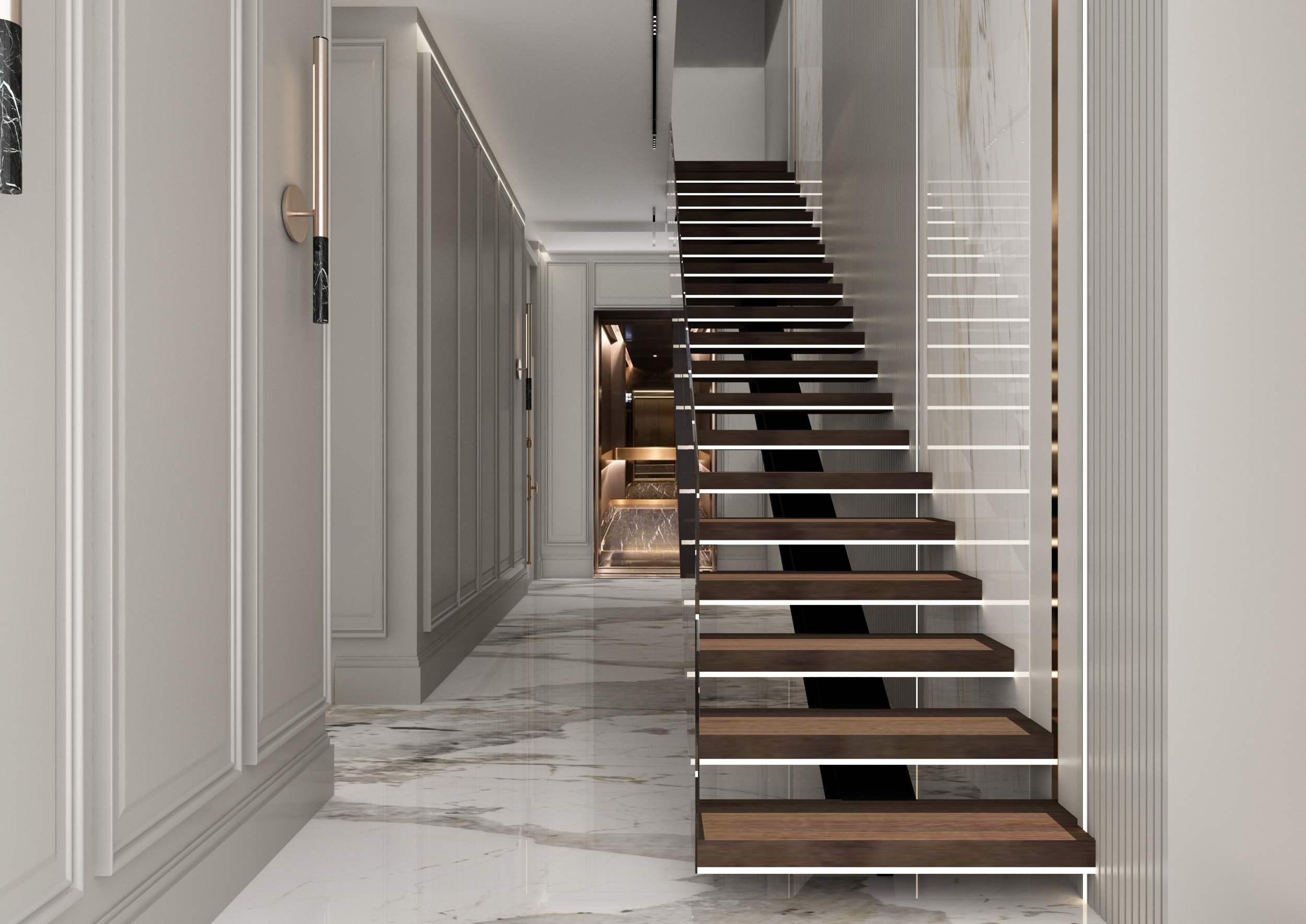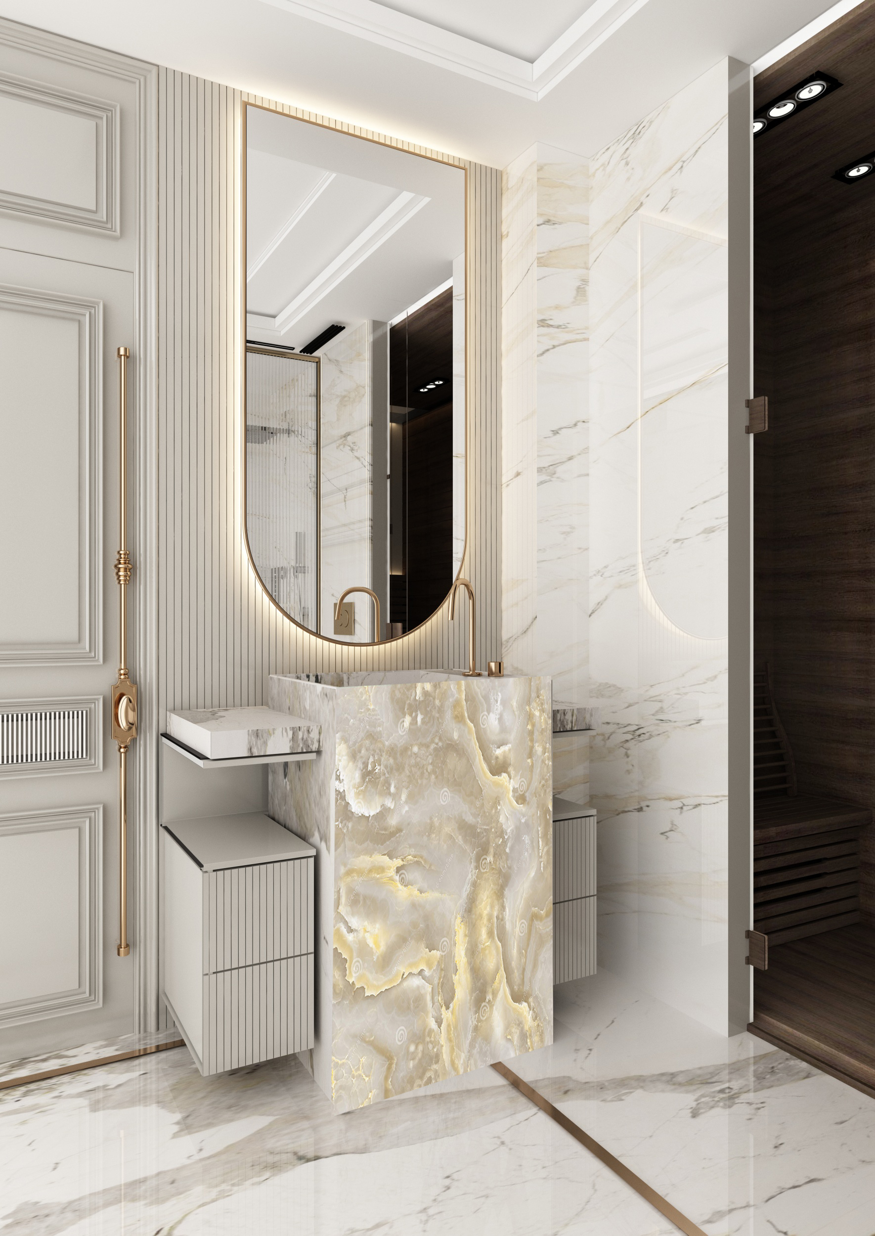 The interior design emphasizes wide openings and spacious volumes, aiming to maximize the amount of natural light entering the spaces. Thanks to the intelligent lighting systems used in the bedrooms, the space can be adapted to different moods and usage scenarios. The marble surfaces chosen for the bathrooms, combined with brass details, create a luxurious and timeless elegance.