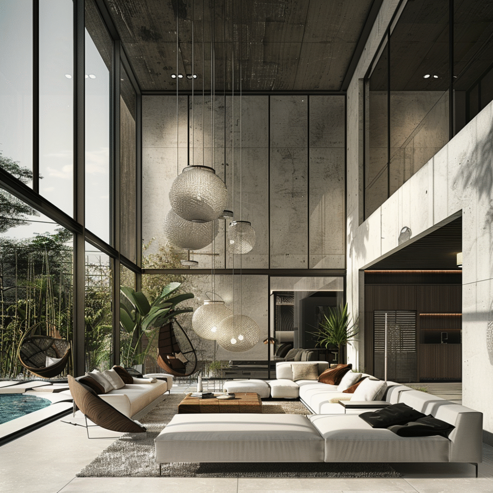 Living spaces with high ceilings and extensive glass surfaces flood the interior with natural light while providing uninterrupted access to the greenery outside. The simple combination of concrete, wood, and glass gives the space a modern and timeless identity.