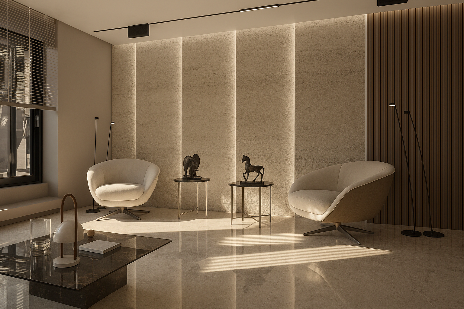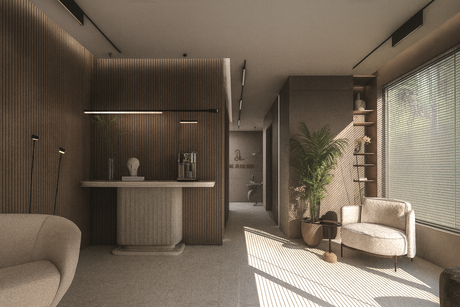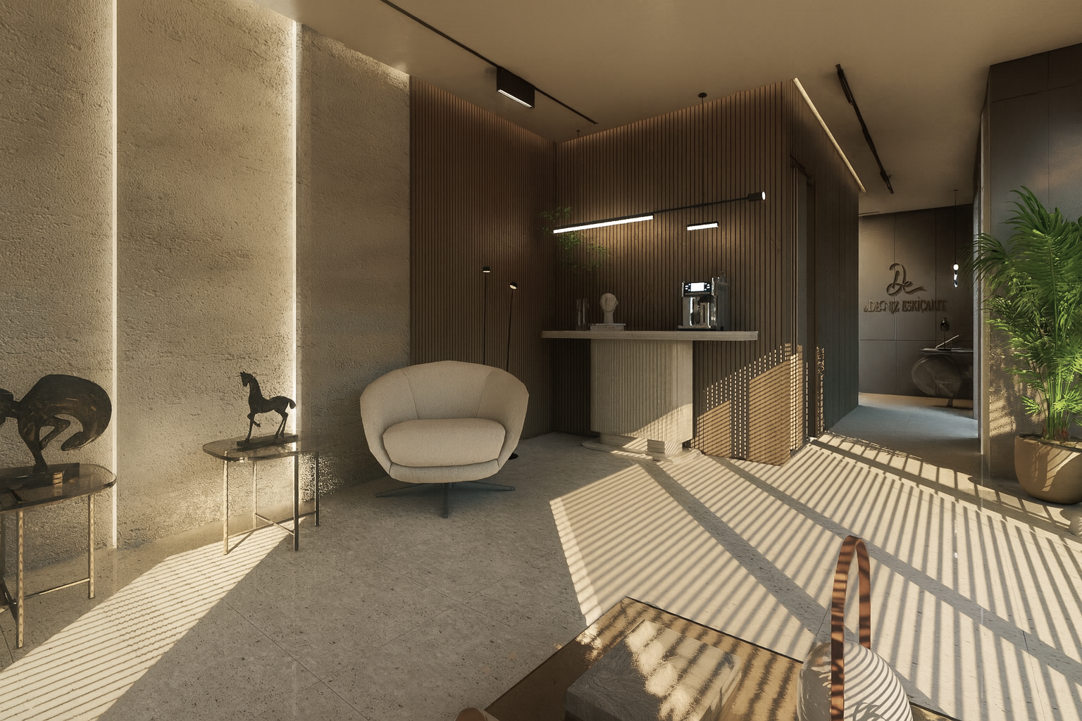 Wide openings, allowing natural light to diffuse evenly throughout the space, were supported by a neutral color palette and simple furniture selections. Wood textures, stone surfaces, and linear lighting created a calm yet powerful atmosphere. Sculptural objects and art accents in the waiting areas enhanced the space aesthetically, giving it a personal identity.