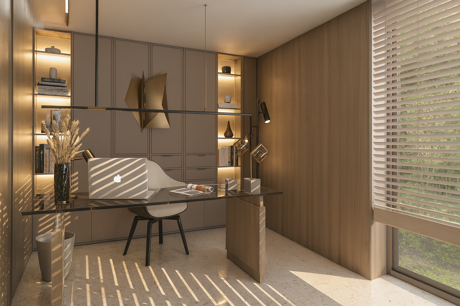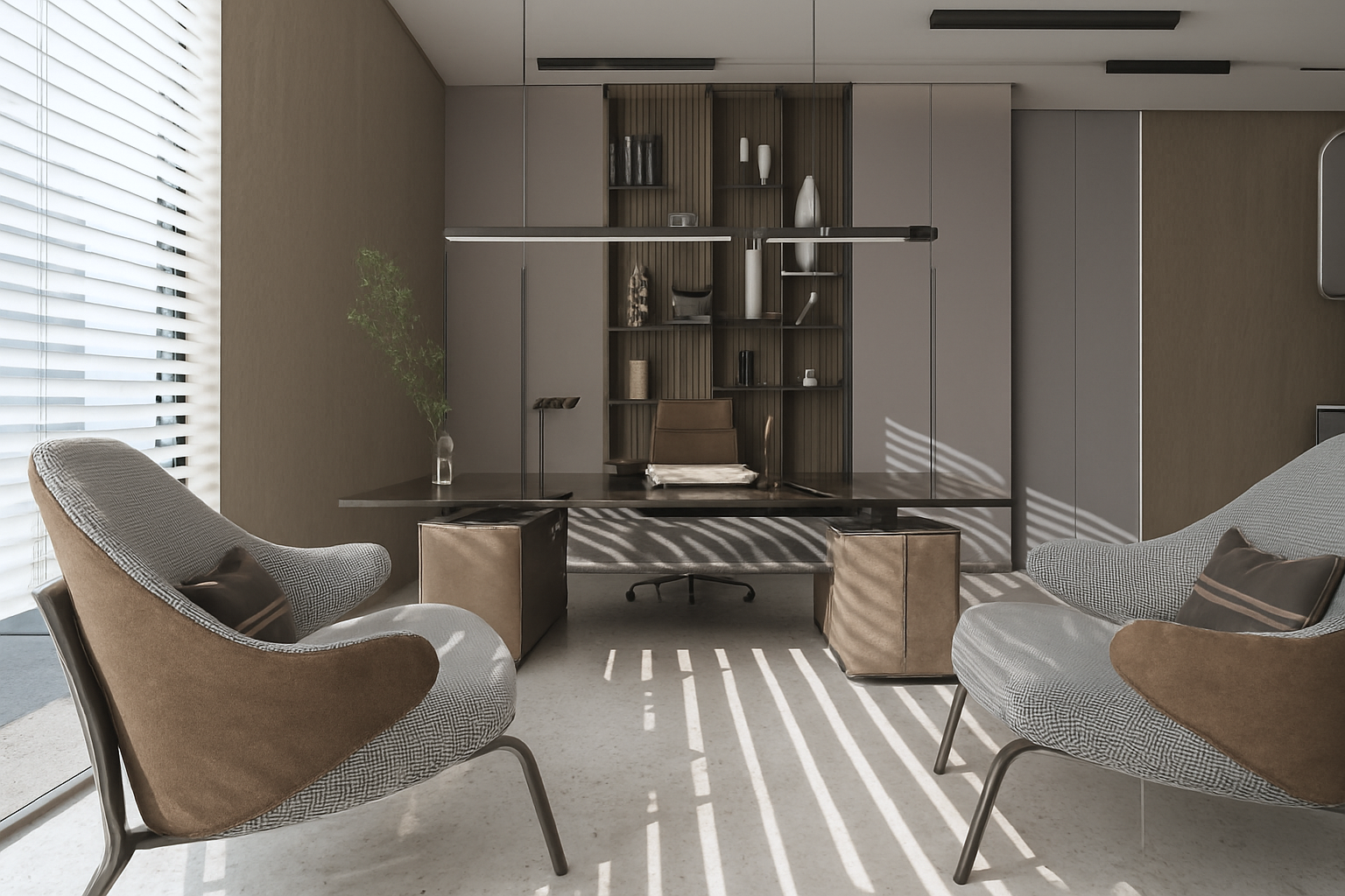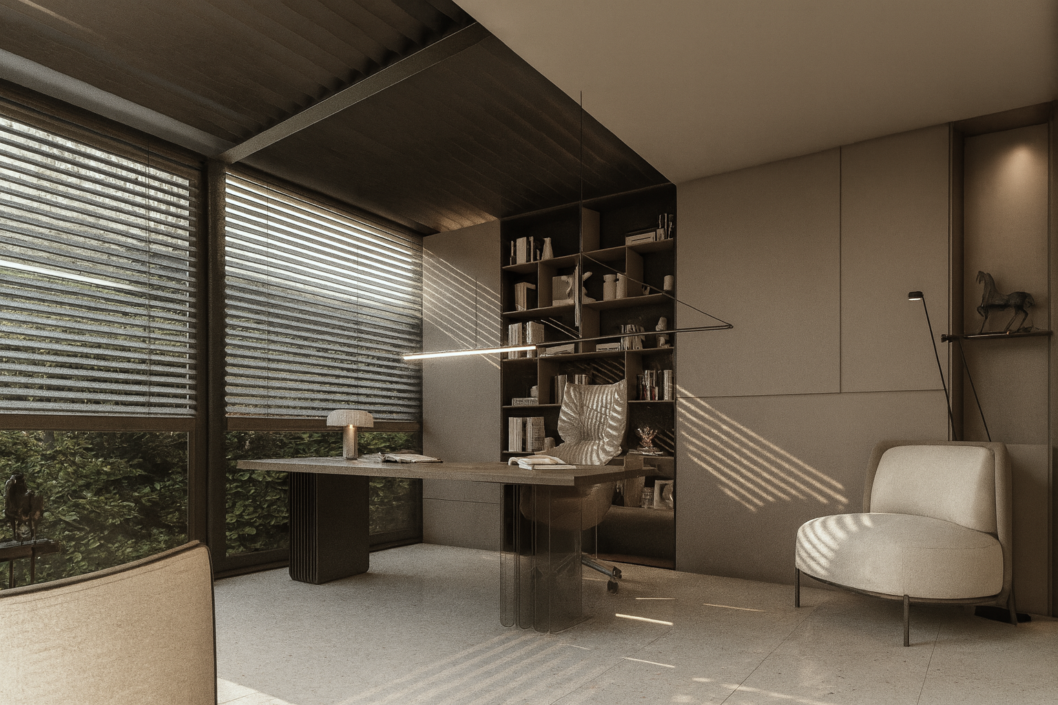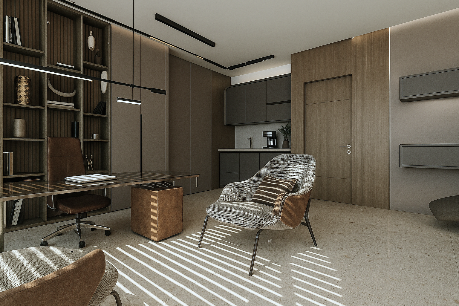 Wide openings, allowing natural light to diffuse evenly throughout the space, were supported by a neutral color palette and simple furniture selections. Wood textures, stone surfaces, and linear lighting created a calm yet powerful atmosphere. Sculptural objects and art accents in the waiting areas enhanced the space aesthetically, giving it a personal identity.