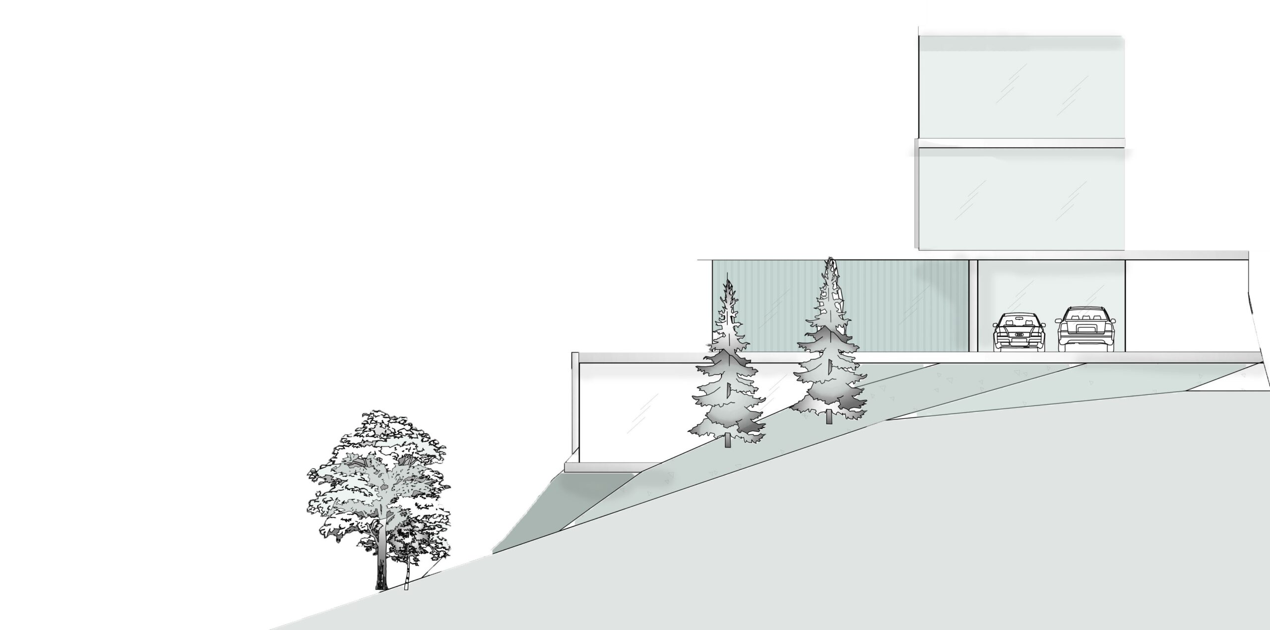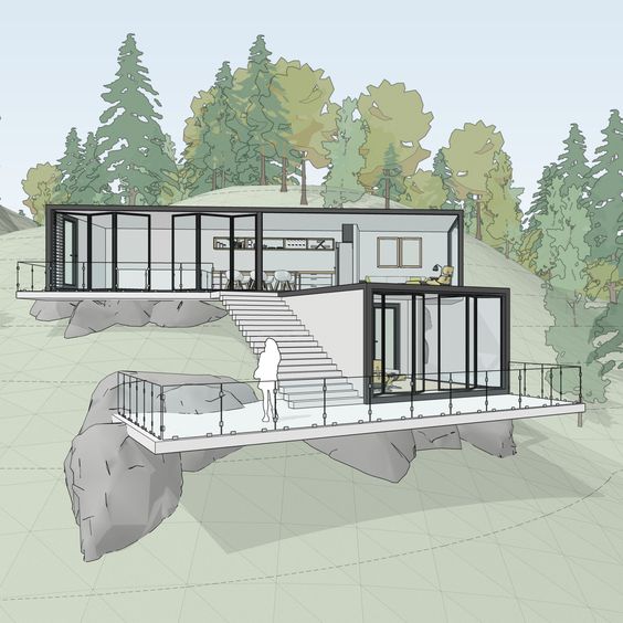 Eğimli araziye uyumlu şekilde konumlandırılan kütleler, teras ve çıkmalarla manzaraya yönelirken; geniş cam yüzeyler doğa ile iç mekân arasında kesintisiz bir görsel bağ kurar. Beton ve camın yalın birlikteliği, hem güçlü bir mimari ifade yaratır hem de çevredeki dağ ve orman dokusunu vurgular.