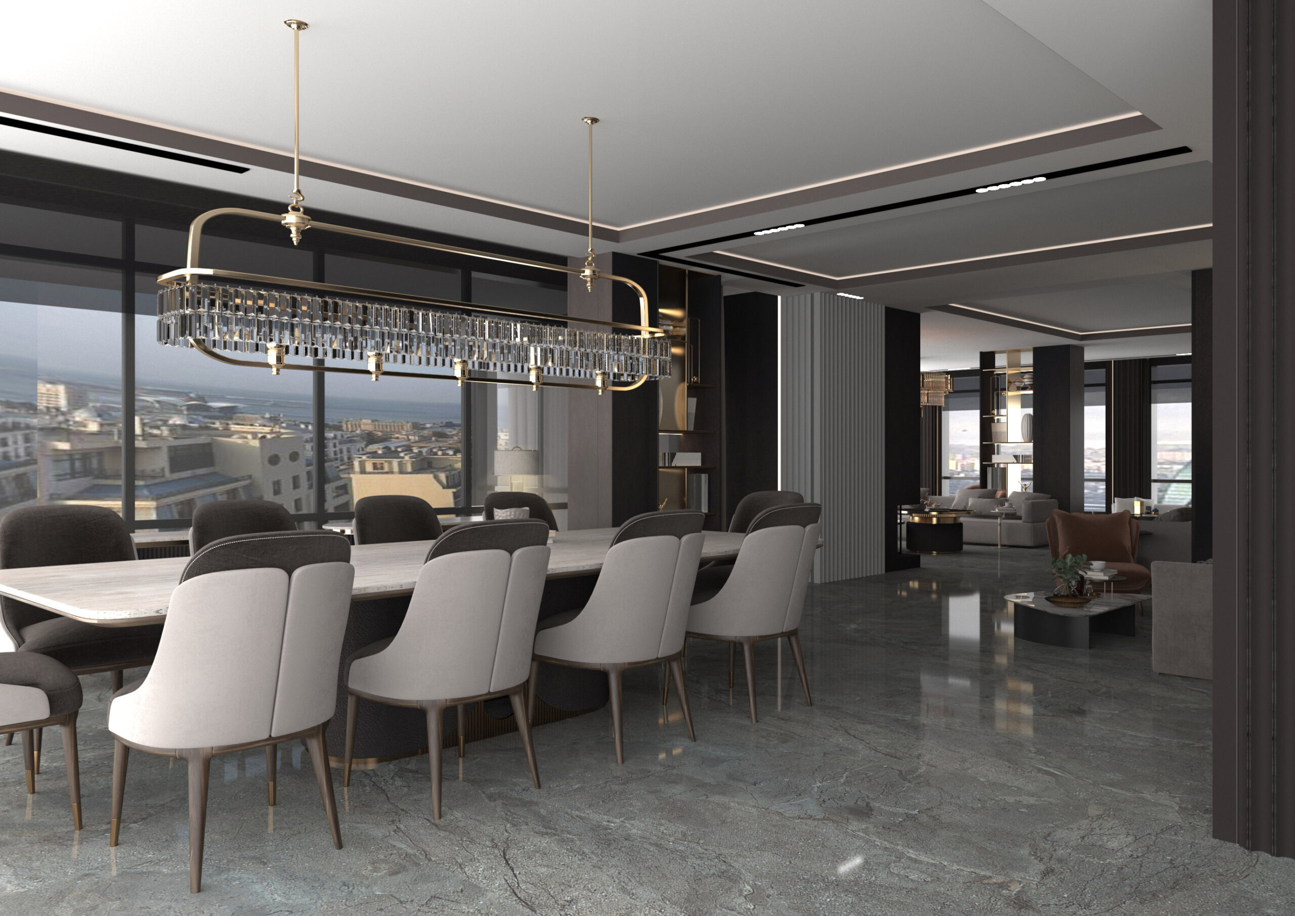Geniş pencereler sayesinde panoramik şehir manzarası iç mekânla bütünleşmektedir.